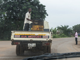 Ghana. Tema. 2016. Man with oil barrel on pick-up truck near Tema port.