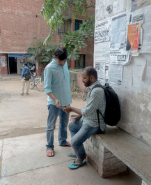 INDIA. Delhi. 2016. Kanhaiya Kumar talking to a friend at a tea shop outside his university hostel.