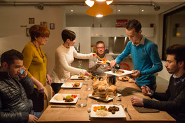 BELGIUM. Brussels. 2016. Serving the Afghan dinner Zafar cooked.