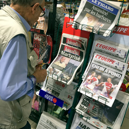 FRANCE, Rouen, Saint-Etienne du Rouvray. 2016/07. After the 7/27 terrorattack when a priest was beheaded by ISIS hostage takers in the local church. Headlines "TERROR" "KILLED BY BARBARIANS" "MARTHYRED".