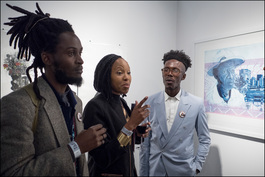 South Africa. Johannesburg. Visitors to an art exhibition opening at the multi-racial gallery in the Turbine Hall in downtown Johannesburg. Some of the students on the Of Soul and Joy Project at the BuhleBuzile Secondary School are exhibited here. 2016.