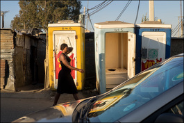 South Africa. Alexandra. A smartly dressed young woman walks past toilets situated by the side of the road in this part of the township north east of Johannesburg where few homes have electricity or running water. 2016