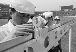 JAPAN. Tokyo. Olympic Games. 1964. National Stadium. The Japanese invented and developed instruments for timing and measuring. They are being tested by the umpires (all dressed in white shirts and hats, and gray trousers) on the tracks.