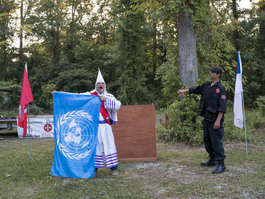 2015. Maryland. USA. A member of the KKK describes his belief that the United Nations is training ISIS on American soil in concert with the federal government in order to take away the guns of American citizens. Moments later the flag was set on fire.