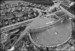 JAPAN. Tokyo. Olympic Games. 1964. National Gymnasium designed by the Japanese architect Kenzo Tange. Swimming hall (seating for 15 000 spectators). Olympic village in the background, a former US military and private area called Washington Heights. The village was handed over to the Japanese Government to be used for the Olympics.