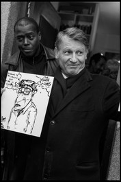 FRANCE. Paris. Jan. 9, 2017. Vincent PEILLON, candidate to the Primaries of the Left for the Presidential elections, visits an art center in the Montreuil popular neighbourhood. He is offered two caricatures drawn by a local artist.
