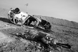 IRAQ. 2016. The body of an ISIS fighter who was killed when he went towards soldiers of the 9th Iraqi armored division. The vehicle next to him is probably a car bomb. He has a suicide vest on and there are also two large unexploded bombs next to his body. Entesar neighborhood in the eastern side of the city of Mosul.
