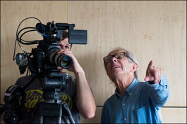 GB. England. London. British film and TV director Ken Loach is known for his socialist ideals and for films such as Kes and Cathy Come Home. Two of his films, The Wind That Shakes the Barley (2006) and I, Daniel Blake (2016) received the Palme d'Or at the Cannes Film Festival, making him the ninth filmmaker to win the prestigious award twice. Loach is making a film of Jeremy Corbyn, MP for Islington North and the current Labour Party leader, in the offices of the UNITE trade union in London. Here, Loach directs his cameraman and checks the viewfinder. 2016