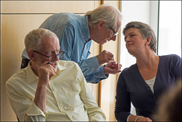 GB. England. London. British film and TV director Ken Loach is known for his socialist ideals and for films such as Kes and Cathy Come Home. Two of his films, The Wind That Shakes the Barley (2006) and I, Daniel Blake (2016) received the Palme d'Or at the Cannes Film Festival, making him the ninth filmmaker to win the prestigious award twice. Loach is making a film of Jeremy Corbyn, MP for Islington North and the current Labour Party leader, in the offices of the UNITE trade union in London. Here, he discusses with a member of his film crew behind Corbyn's back how the filming is to proceed. 2016