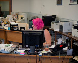 USA. La Grande, OR. 2015. Grace at her desk in the Credit Bureau.