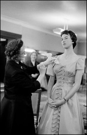 ENGLAND. London. 1958. Elfrida Eden being fitted for her Queen Charlotte Ball dress.