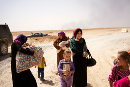 IRAQ. Makhmour Front Line. JuLy 25, 2016. Women and children fleeing ISIS-controlled areas near the Iraqi town of Qayarah arrive at a Peshmerga front line position on the outskirts of Makhmour.