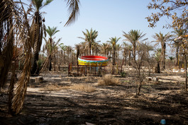 IRAQ. Al-Sodour, Diyala Province. July 22, 2016. Burned palm trees remain inside the Al-Sodour Tourist Park, near the Al-Sodour Dam in Iraq's Diyala Province. In January of 2015 Iraqi security forces, backed by Shiite militias, fought a decisive battle in and around the tourist park against Islamic Sate militants controlling the area. After a fighting for more than ten days, Iraqi forces regained control of the area.