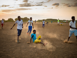 KENYA. 2016. A team of young boys playing football in the Kakuma...