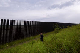USA. Brownsville. Texas. 2016. The border wall just outside of Brownsville on the land of the Nature Conservancy, home to one of two Sabel Palm groves in the United States. The fence has smalls holes cut in it, ostensibly to continue to allow normal migratory patterns of animals who traditionally crossed the land now blocked by the fence.