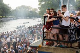 GB. England. Oxford. Summer Eights rowing competition. The Summer Eights are a huge event in the University calendar. Whichever crew becomes ‘ Head of the River’ (i.e. wins the 4 day race, by not being bumped off the number one slot) traditionally takes an old wooden boat, with the cox carried on the top, as they sing and parade their way back to their college. Oriel College in recent years has consistently won this competition. When the boat is back at the college, it is smashed and burned later that evening after the celebratory dinner. 2016.