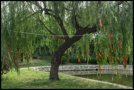 CHINA. Henan Province. Kaifeng. The Iron Pagoda, a Buddhist temple dating to the Northern Song Dynasty. Buddhist offerings of red ribbons to the Temple of Inspiration.