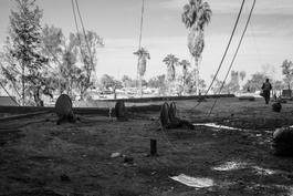 IRAQ. Habbaniyah. February 2, 2016. TV satellite dishes and trash on the roof of the Habbaniyah Tourist City Hotel, a former vacationing resort that is now home to hundreds of displaced Sunni families from Ramadi and Fallujah. Sanitary conditions inside the hotel are dire due to the lack of running water and sewage system.