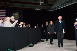 USA. Rindge, NH. 2016. Bernie Sanders comes on stage at a rally at Franklin Pierce University before the New Hampshire primary. Donald Trump ultimately won the Republican primary and Bernie Sanders won the Democratic.