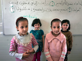 JORDAN. 2016. Children at a local school in the Za'atari camp...