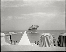 ITALY. Ischia. Lacco Ameno. The beach of the resort town with the rock formation Fungo in the background. 1934. L-IT-LIG-001