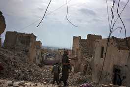 Kurdish PKK fighters from Turkey amid the ruins of Sinjar, Iraq.