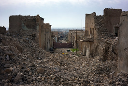 A large cloth positioned to block the line of sight of snipers amid the ruins on a deserted street in Sinjar, Iraq.