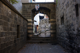 A barricade made from sandbags blocks the entrance to an alleyway in the Sur district of Diyarbakir, a PKK stronghold under the control of Kurdish militants. In late 2015 the Turkish Army entered Sur with tanks and heavy weapons, destroying much of the district.