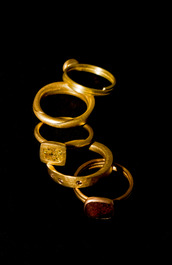 GB. England. London. 2016. Fair Trade. Cox + Power. A collection of gold rings designed and made by Tony Power in his studio behind his shop.