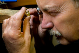 GB. England. London. 2016. Fair Trade. Cox + Power. Tony Power uses a loup to examine a gold ring for flaws in the studio behind his jewellery shop.