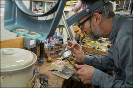 GB. England. Surrey. Guildford. 2016. Cranleigh. Jon Dibben Shop and Studio. Jon at work in his studio heating a piece of gold with a burner until molten.