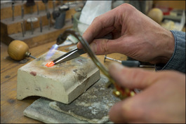 GB. England. Surrey. Guildford. 2016. Cranleigh. Jon Dibben Shop and Studio. Jon at work in his studio, heating a piece of gold until molten with a burner.