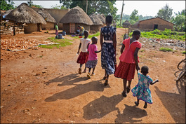Africa. Uganda. Near Tororo. 2016. Fair Trade. Josephine Aguttu and her family walking to the Tiira Miracle Centre Church.