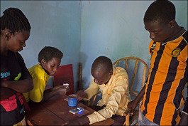Africa. Uganda. Near Tororo. 2016. Fair Trade. Miners at the Busia United Mine sell their gold to a middle man (centre) who having weighed it is checking gold prices on his phone in front of the buyer (right) who also checks gold prices on his phone.