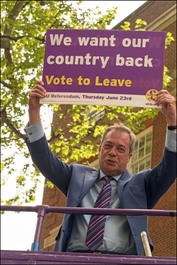 GB. England. London. 2016. Brexit. Nigel Farage, born 3 April 1964, is the leader of the UK Independence Party (UKIP). Since 1999 he has been a Member of the European Parliament (MEP) for South East England. He co-chairs the Europe of Freedom and Direct Democracy. Here he stands on the top deck of his battle bus as it leaves Smith Square, holding a 'We want our country back' and 'Vote to Leave' placard at the launch of his campaign to canvass votes around the country in favour of Brexit.