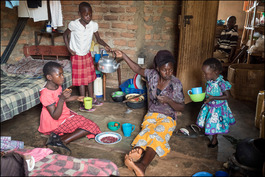 Africa. Uganda. Near Tororo. 2016. Fair Trade. Fair Trade's Josephine Aguttu at home, breakfasting with her family.