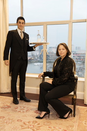 GB. England. London. The Savoy Hotel. Regular guest Margaret Fountain with Butler, Mihai Soroia. 2016.