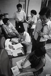 USA. Los Angeles, California. A family arriving at Los Angeles airport and being helped with paperwork.