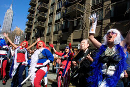USA. New York City. March 22, 2003. Demonstration against Iraq War. Street art as protestors march down Broadway to Washington Square Park.