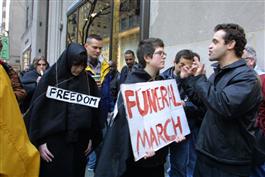 USA. New York City. March 27, 2003. Anti-war demonstrators stage a "die-in" outside of Rockefeller Center to symbolize Iraqi war victims.