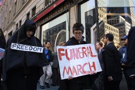USA. New York City. March 27, 2003. Anti-war demonstrators stage a "die-in" outside of Rockefeller Center to symbolize Iraqi war victims.