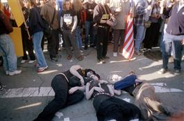 USA. San Francisco. January 1, 2003. Three young activist women, in makeup depicting war victims and carrying baby dolls streaked with blood, take part in a demonstration against war in Iraq. When they reached the plaza, they slumped as one and silently fell to the street still as death.