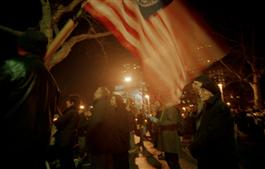 USA. New York City. March 5, 2003. An elderly couple stand under an American flag at a peace rally in Washington Square Park. At dusk hundreds of activists paraded down Fifth Avenue with banners and lighted candles to join hundreds of others who gathered there earlier to protest war in Iraq.