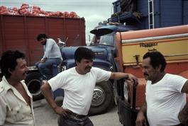 U.S.-MEXICAN BORDER. 1988. Truckdrivers wait in line to passs through U.S. customs.