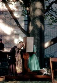USA. Uniontown, Pennsylvania. 1964. A priest of the Byzantine rite of the Catholic church hears an outdoor confession during a pilgrimage.