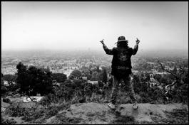 USA. Hollywood, California. 1988. "Slayer, Errol Flynn Squat, Hollywood." Hilltop gesture of anger and disgust.