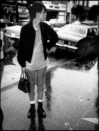 USA. Hollywood, California. 1990. "Ragdoll with Patent Leather Purse." Ragdoll on Hollywood Boulevard with her patent leather purse, waiting to go panhandle in the rain so that she can get food and beer. She is pregnant.