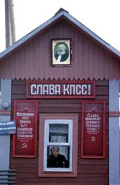 USSR. Russia. 1963. A crossing guard hut on a railroad near Bratsk. Slogans proclaim glory to railroad workers and the USSR.
