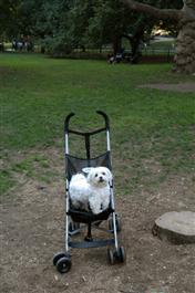 USA. New York City. 2002. Dog on a stroller in Central Park.