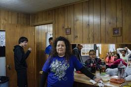 USA. Near Hugo, Oklahoma. 2014. The Davidson family gathers for their weekly Wednesday meal at their family church, the Goodwater. Dozens of family members gather for a church service, singing, trivia, a giant meal, and playtime. Outside the church is the family cemetery. Many Choctaw families are large and continue to live in the region, and family gatherings are frequent.